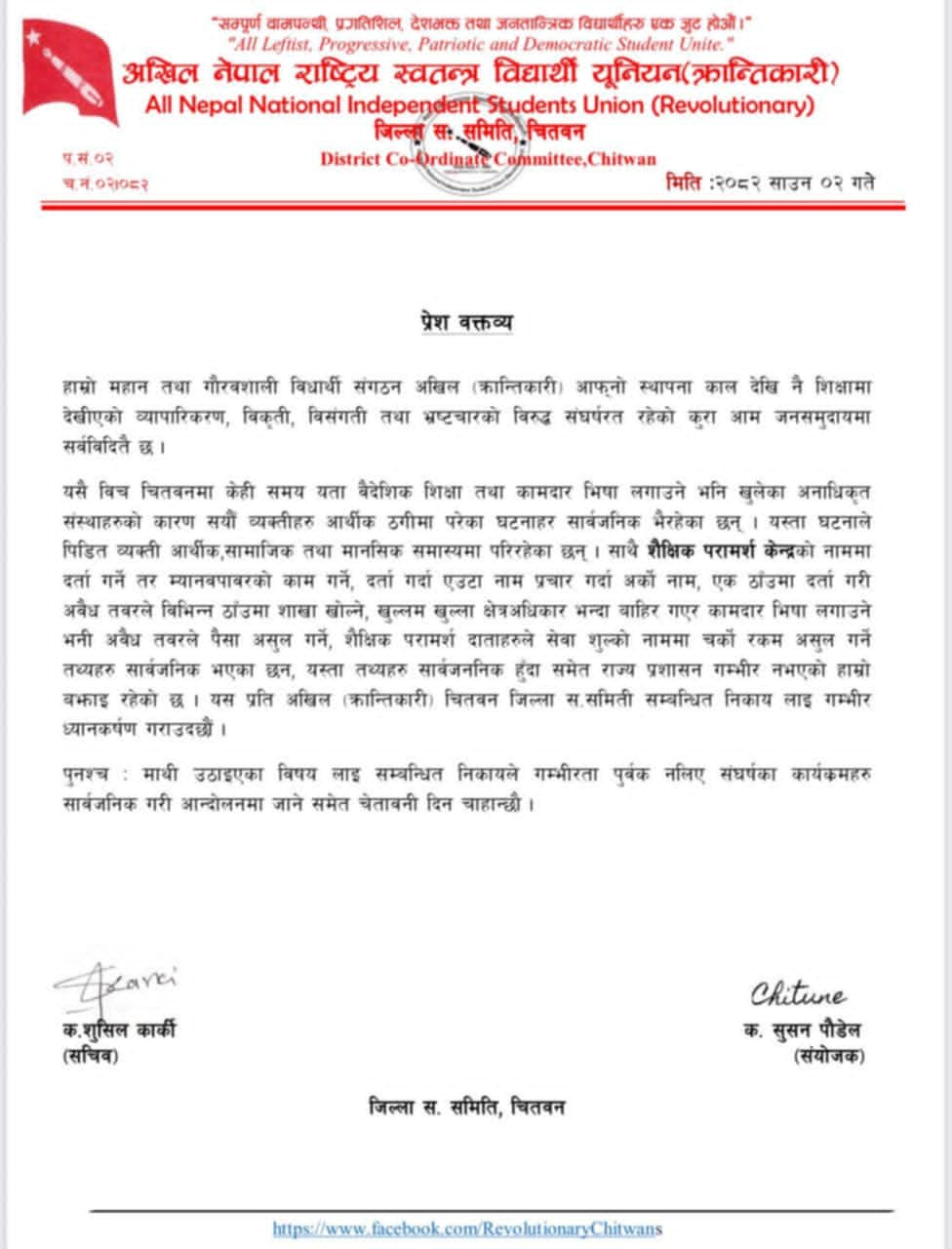 केही वर्ष देखि देशका विभिन्न भागहरुमा शैक्षिक परामर्शकाे नाममा हजारौं विद्यार्थी तथा अभिभावकहरु ठगिएका छन् । देशमा बढ्दाे बेराेजगारी र सरकारकाे फितलो अनुगमन एवम् वैदेशिक शिक्षा लाभका नाममा विद्यार्थीहरु पछिल्लो दशक मानसिक प्रताड्ना र भनेको जस्तो विदेशमै पनि नहुँदा आत्महत्या दर बढेकाे पाईएकाे छ । वैदेशिक शिक्षा सुझाव दिने थलाेकाे रुपमा विकास हुनुपर्नेमा शैक्षिक कन्सल्टेन्सीहरु विगत वर्षहरु देखि मानव तस्करकाे रुपमा वैदेशिक मेनपावर संचालन गरिरहेका छन । जिल्लामा केही दिन अगाडि चितवनका मिडियामा र माओवादी केन्द्र निकट विद्यार्थी संगठन काे विराेधका कारण अवैध कन्सल्टेन्सीकाे बारेमा जिल्ला प्रशासन कार्यालय चितवनले केही कन्सल्टेन्सीहरुमा छापा मारेकाे थियोे । तर पनि आम विद्यार्थी र अभिभावकहरु उचित शुल्क भन्दा दाेब्बर तेब्बर रकम बुझाउदा पनि विदेशमा काम नपाउने काेर्ष पूरा गर्न कन्सल्टेन्सीले जथाभावी प्रलोभनमा आश्वासन पार्ने गरेको र दुख पाएकाे भन्दैमाओवादी केन्द्र निकट विद्यार्थी संगठन चितवनका जिल्ला सचिव सुशील कार्की र जिल्ला संयाेजक सुसन पाैडेल हस्ताक्षरित विज्ञप्तिमा आन्दोलनका कार्यक्रम संचालन गर्ने चेतावनी सहित कन्सल्टेन्सी र राज्यका निकायहरुलाई ध्यानाकर्षण गराएका छन । हाम्रो महान तथा गौरवशाली विधार्थी संगठन अखिल (क्रान्तिकारी) आफ्नो स्थापना काल देखि नै शिक्षामा देखीएको व्यापारिकरण, विकृती, विसंगती तथा भ्रष्टचारको विरुद्ध संघर्षरत रहेको कुरा आम जनसमुदायमा सर्वविदितै छ ।यसै विच चितवनमा केही समय यता वैदेशिक शिक्षा तथा कामदार भिषा लगाउने भनि खुलेका अनाधिकृत संस्थाहरुको कारण सयौँ व्यक्तीहरु आर्थीक ठगीमा परेका घटनाहर सार्वजनिक भैरहेका छन् । यस्ता घटनाले पिडित व्यक्ती आर्थीक,सामाजिक तथा मानसिक समास्यमा परिरहेका छन् । साथै शैक्षिक परामर्श केन्द्रको नाममा दर्ता गर्ने तरम्यानवपावरको काम गर्ने, दर्ता गर्दा एउटा नाम प्रचार गर्दा अर्को नाम, एक ठाँउमा दर्ता गरी अवैध तवरले विभिन्न ठाँउमा शाखा खोल्ने, खुल्लम खुल्ला क्षेत्रअधिकार भन्दा बाहिर गएर कामदार भिषा लगाउने भनी अवैध तवरले पैसा असुल गर्ने, शैक्षिकपरामर्श दाताहरुले सेवा शुल्को नाममा चर्को रकम असुल गर्ने तथ्यहरु सार्वजनिक भएका छन, यस्ता तथ्यहरु सार्वजननिक हुँदा समेत राज्य प्रशासन गम्भीर नभएको हाम्रो बझाइ रहेको छ । यस प्रति अखिल (क्रान्तिकारी) चितवन जिल्ला स.समिती सम्बन्धित निकाय लाइ गम्भीरध्यानकर्षण गराउदछौं । पुनश्च ः माथी उठाइएका विषय लाइ सम्बन्धित निकायले गम्भीरता पुर्वक नलिए संघर्षका कार्यक्रमहरु सार्वजनिक गरी आन्दोलनमा जाने समेत चेतावनी दिन चाहान्छौ ।