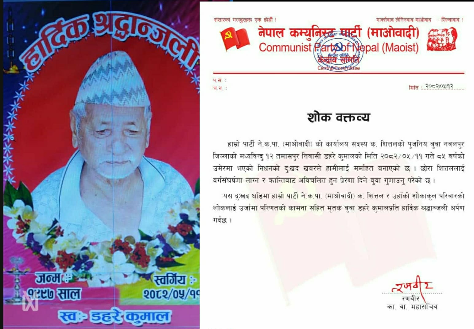 नेपाल कम्युनिस्ट पार्टी (माओवादी ) का नेता तथा केन्द्रीय कार्यालयका सदस्य दल बहादुर कुमाल ´सितल` का बुवा डहरे कुमालकाे २०८२ भाद्र ११ गते अपरान्ह ८५ वर्षको उमेरमा निधन भएको छ ।१९९७ सालमा नवरपुर जिल्लाकाे मध्यविन्दु नगरपालिका वडा नं १२मा जन्मेका डहरे कुमालका दुई श्रीमती , ८ छाेरा र ७ छाेरीहरु छन । सामाजिक रुपमा परिचित डहरे कुमालका छाेराहरु पनि गणतान्त्रिक आन्दोलनमा सक्रिय थिए र ती मध्ये दल बहादुर कुमाल पार्टीको केन्द्रीय नेतृत्व तहमा छन् ।दिवंगत डहरे कुमाल प्रति नेकपा ( माओवादी ) का कार्यवाहक महासचिव रणवीरले भावपुर्ण श्रद्धाञ्जली अर्पण गर्दै पार्टी र परिवारजनमा परेको दु:ख घडीमा समवेदना प्रकट गरेकोे छ ।