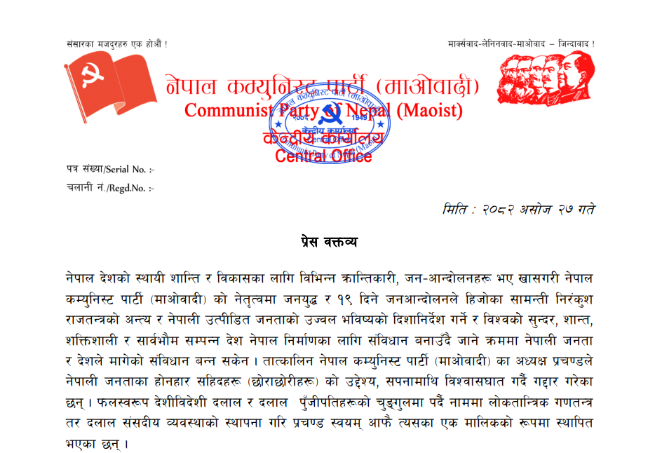 देश गम्भीर मोडमा छ भन्दै नेपाल कम्युनिस्ट पार्टी (माओवादी)को विज्ञप्ती